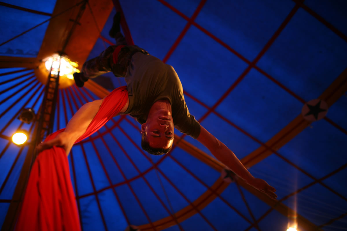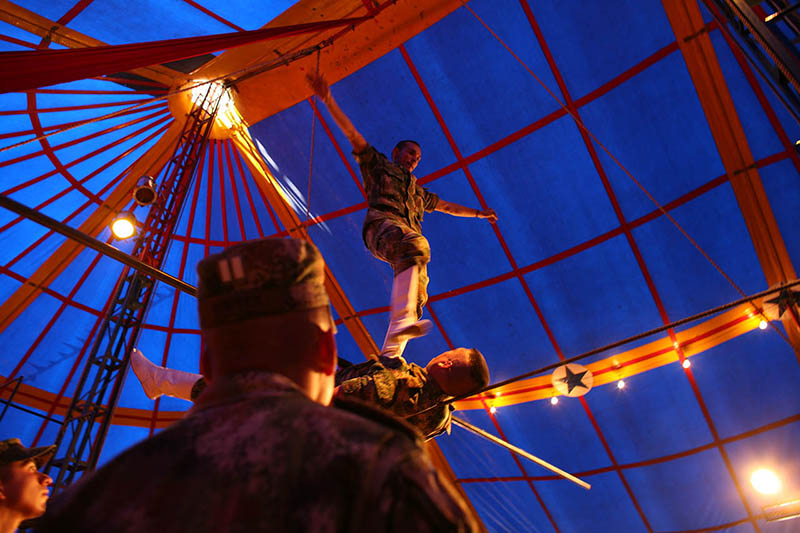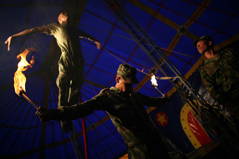 A soldier performs during Colombia's Army Circus show in Soacha, Colombia, Friday, March 5, 2010. Soldiers perform weekly with acrobatics, dance, clown acts and juggling to entertain and interact with communities with limited resources. (AP Photo/William Fernando Martinez)