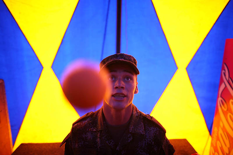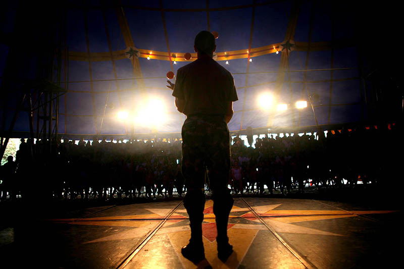 A soldier juggles balls at Colombia's Army Circus in Soacha, Colombia, Friday, March 5, 2010. Soldiers perform weekly with acrobatics, dance, clown acts and juggling to entertain and interact with communities with limited resources. (AP Photo/William Fernando Martinez)