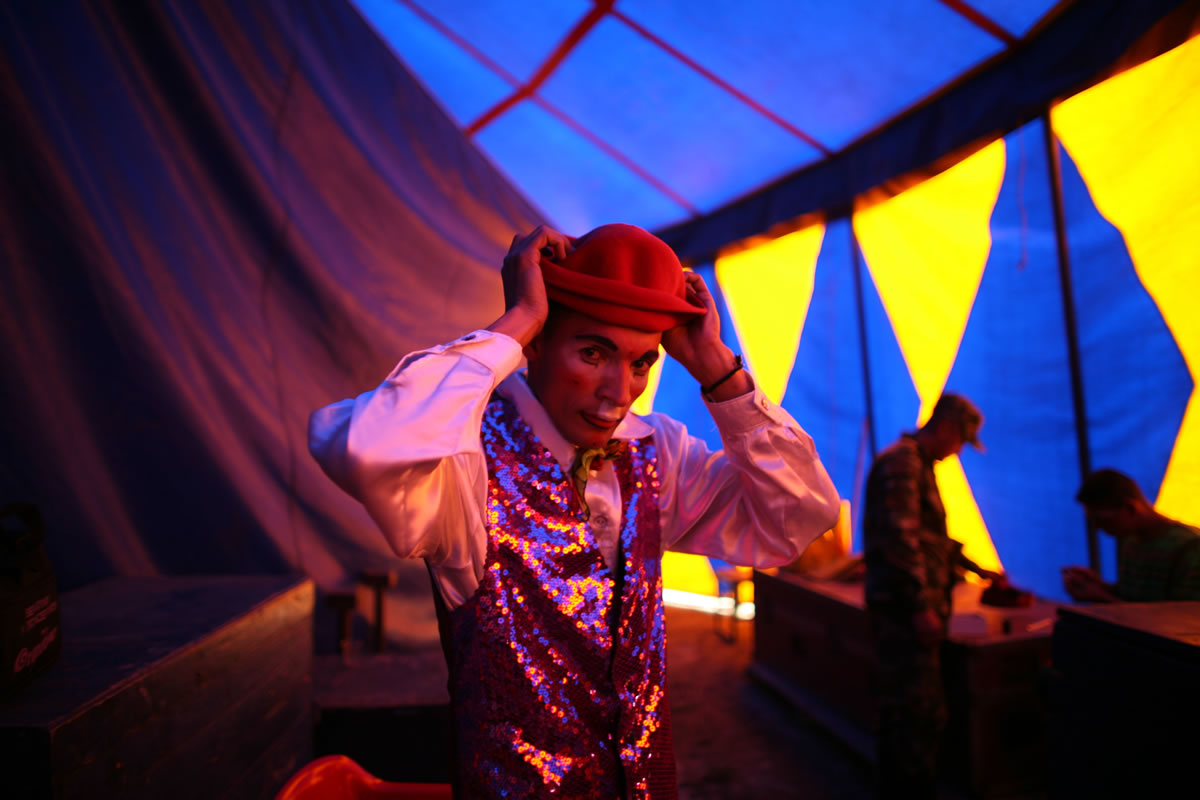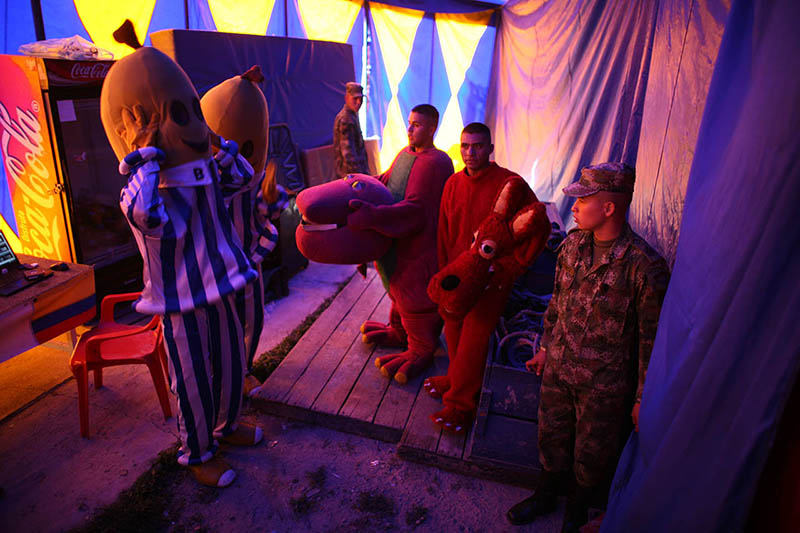 Soldiers prepare backstage before performing in Colombia's Army Circus in Soacha, Colombia, Friday, March 5, 2010. Soldiers perform weekly with acrobatics, dances, clowns and juggling to entertain and interact with communities with limited resources. (AP Photo/William Fernando Martinez)