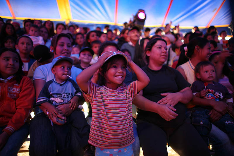 Children watch Colombia's Army Circus show in Soacha, Colombia, Friday, March 5, 2010. Soldiers perform weekly with acrobatics, dance, clowns and juggling to entertain and interact with communities of limited resources. (AP Photo/William Fernando Martinez)
