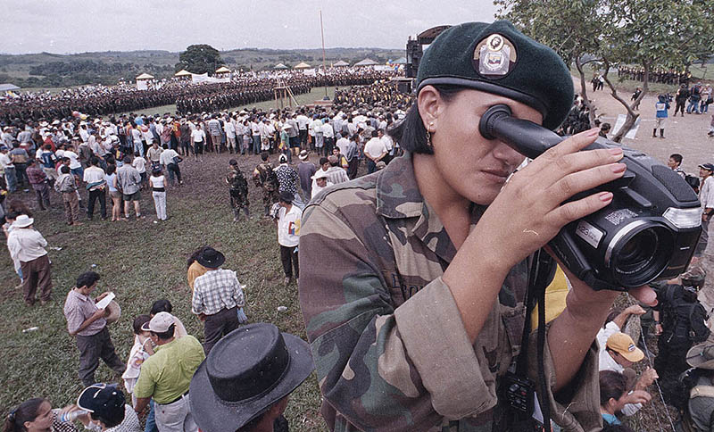 A rebel of the Revolutionary Armed Forces of Colombia, or FARC, films during the ceremony for the Bolivarian Movement, a new clandestine political party for the rebels, outside of San Vicente del Caguan in the FARC controlled zone of Colombia on Saturday, April 29, 2000. The FARC are Colombia's oldest and largest rebel group, numbering over 15,000. (Photo/ William Fernando Martinez)