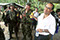 Some of the 242 police and soldiers captured in battle by rebels speak with Revolutionary Armed Forces of Colombia, or FARC, commander Pedro Antonio Marin, Manuel "Sureshot" Marulanda., in La Macarena, in the rebel controlled area located in southern Colombia, as they are escorted by rebel of the Revolutionary Armed Forces of Colombia (FARC), Thursday, June 28, 2001. Colombia's most powerful guerrilla army freed the war prisoners Thursday, calling the mass release of government soldiers and police a gesture of peace. (Photo/ William Fernando Martinez)